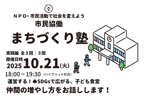 【セミナー(オンライン有)】郡山市市民活動サポートセンター主催 市民協働まちづくり塾(実践編)第3回/全3回「 運営する!♠SDGsで広がる、子ども食堂『仲間の増やし方をお話しします!」開催のお知らせ