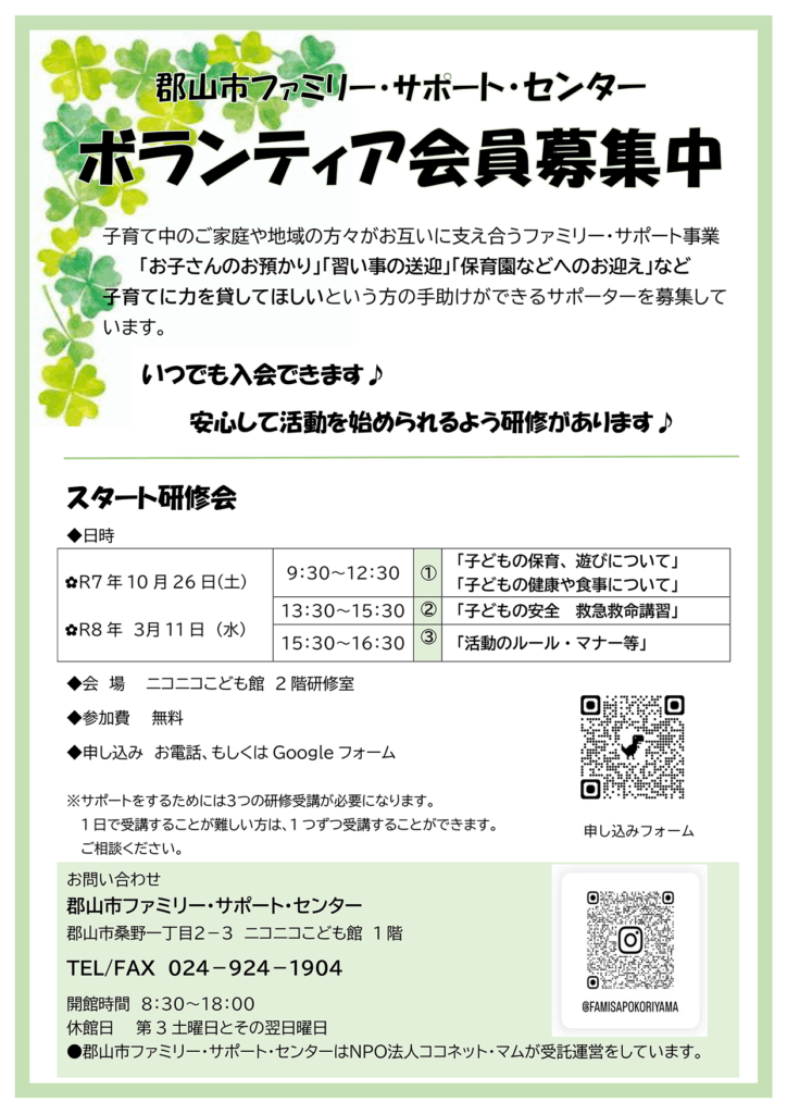 【登録団体の広報(ボランティア)】郡山市ファミリーサポートセンター「ボランティア会員 スタート研修会」参加者募集のお知らせ