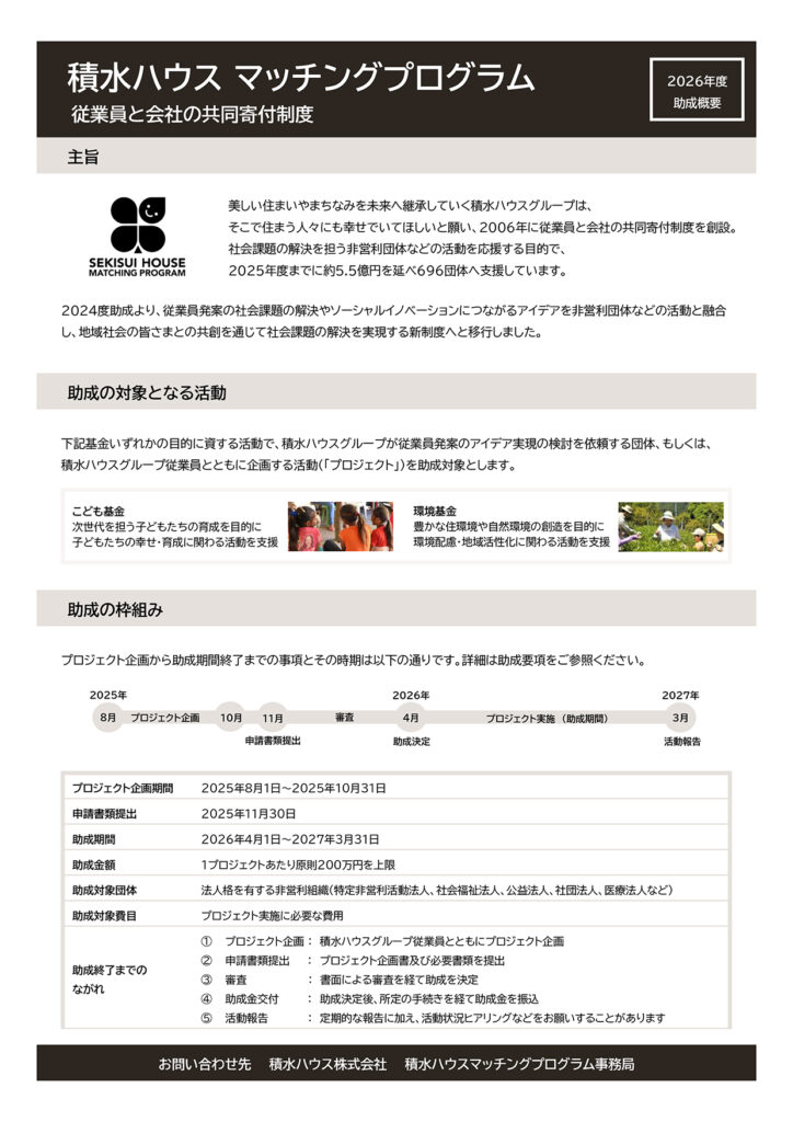 【助成金(こども・環境分野)】積水ハウスマッチングプログラム2026年度助成募集のお知らせ