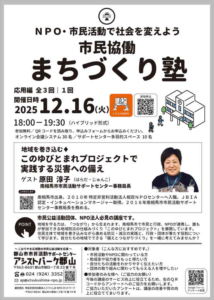 【セミナー(オンライン有)】郡山市市民活動サポートセンター主催 市民協働まちづくり塾(応用編)第1回/全3回「 地域を巻き込む♦このゆびとまれプロジェクトで実践する災害への備え」開催のお知らせ