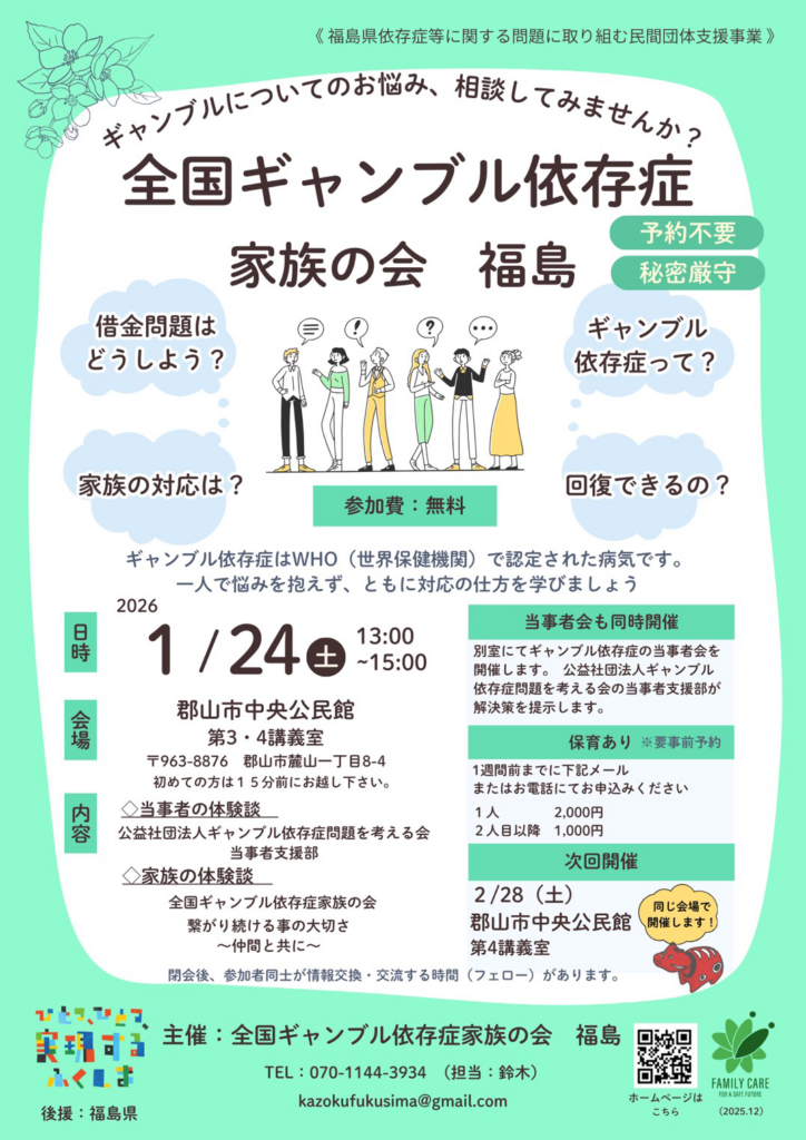 【登録団体の広報(相談会)】全国ギャンブル依存症家族の会 福島 2026年1月の活動案内