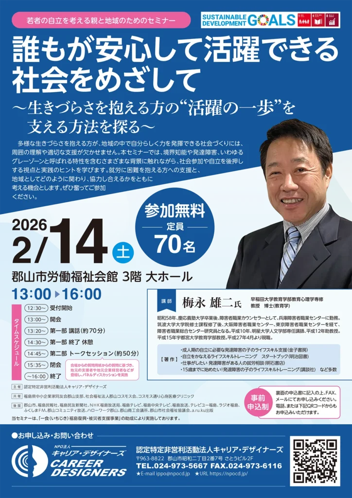 認定特定非営利活動法人キャリア・デザイナーズは、地域の皆様と一緒に若者や誰もが活躍できる地域づくりを目指しセミナーを開催します。