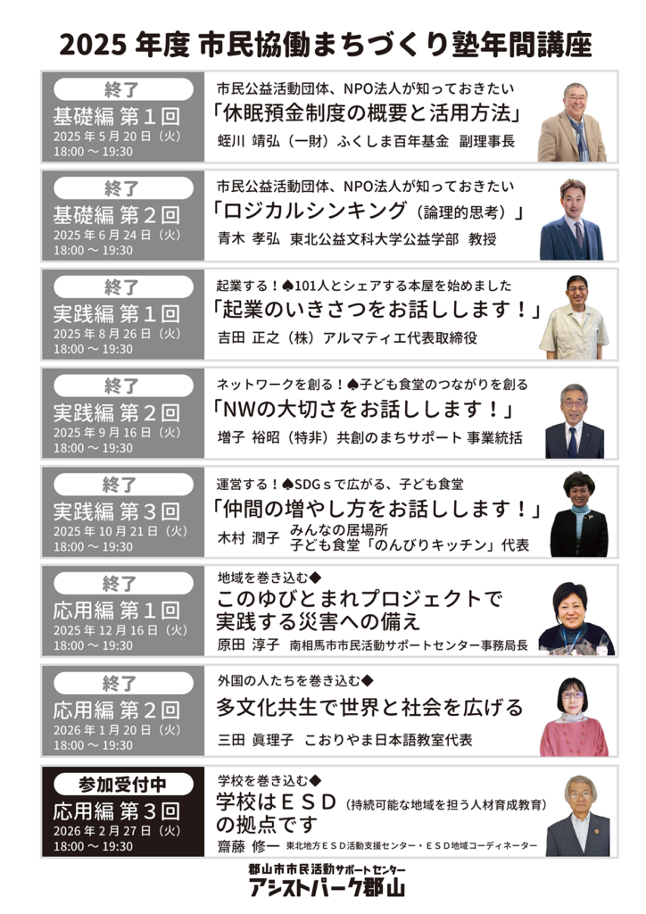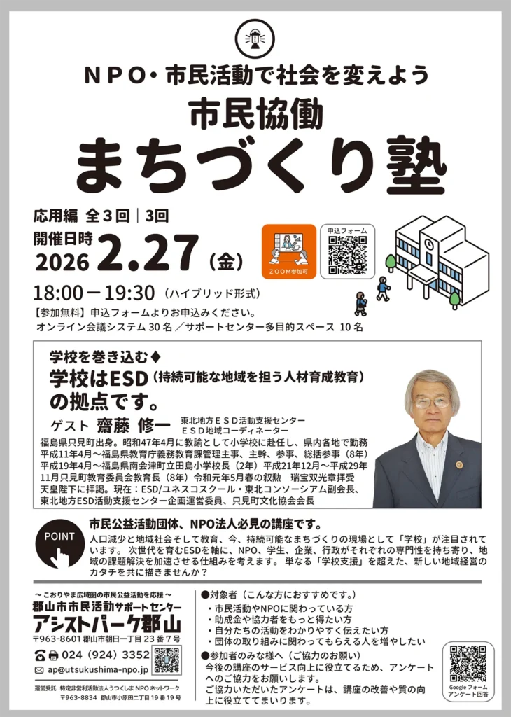 【セミナー(オンライン有)】郡山市市民活動サポートセンター主催 市民協働まちづくり塾(応用編)第3回/全3回「 学校を巻き込む♦(持続可能な地域を担う人材育成教育)の拠点です」開催のお知らせ
