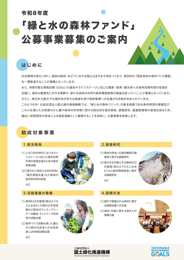 【助成金(自然環境分野)】(募集締切:2026年3月15日)公益社団法人国土緑化推進機構 令和8年度「緑と水の森林ファンド事業」助成団体募集のお知らせ