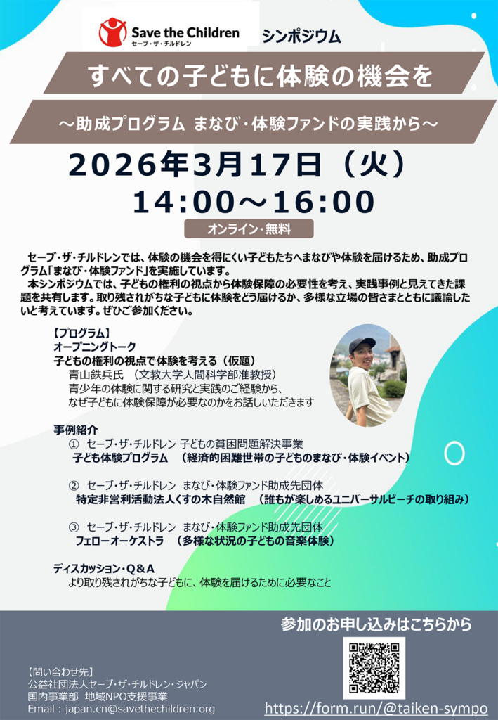 【シンポジウム(オンライン)】公益社団法人 セーブ・ザ・チルドレン・ジャパン主催シンポジウム「すべての子どもに体験の機会を」開催のお知らせ