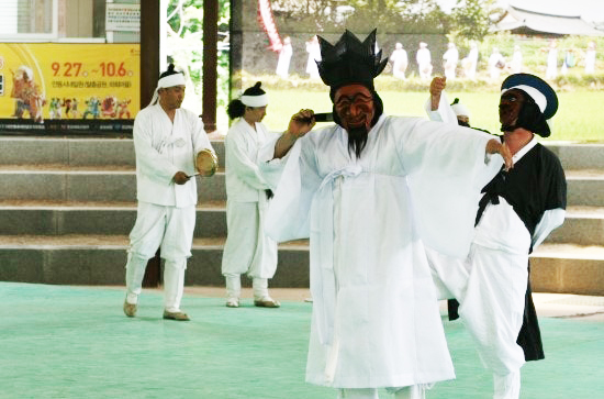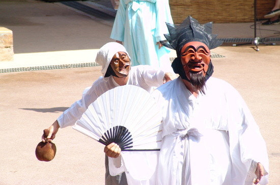 社団法人国家無形遺産河回別神グッタルノリ保存会による伝統芸能の仮面劇(舞踊)ステージ