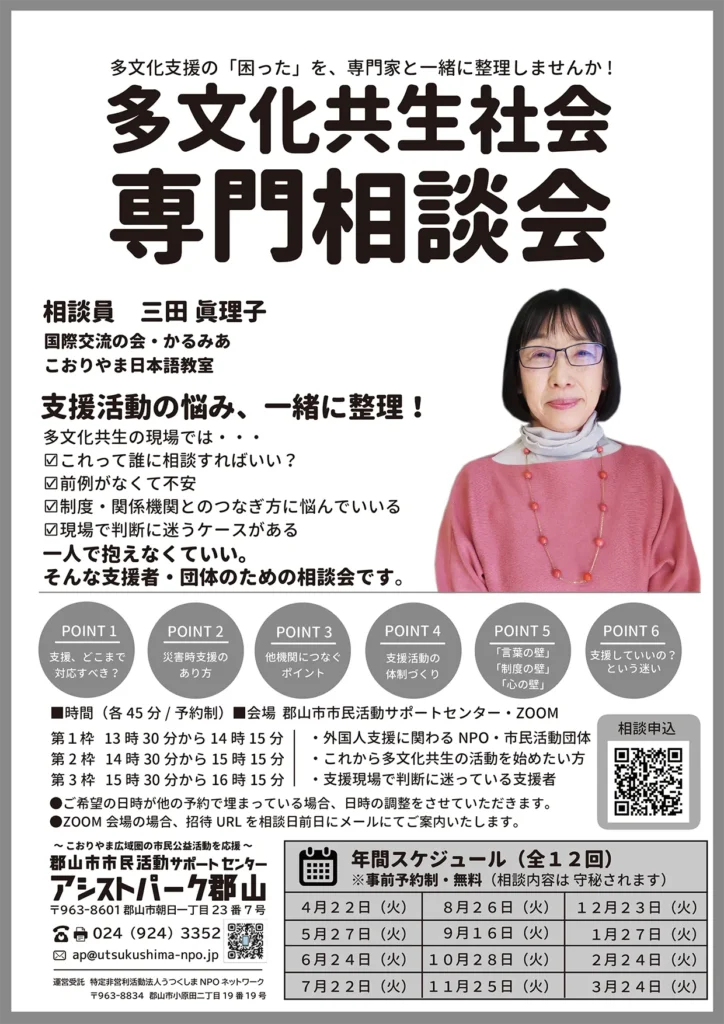 外国にルーツを持つ人々が、互いの違いを認め合い、対等な関係を築こうとしながら社会に参加することを通じて実施される、誰もが暮らしやすい多文化共生の地域づくりの実現に向け、外国人や会社や学校、地域などで公益的な活動を行っている団体、これから活動に取り組みたい個人への専門相談会を開催します。
